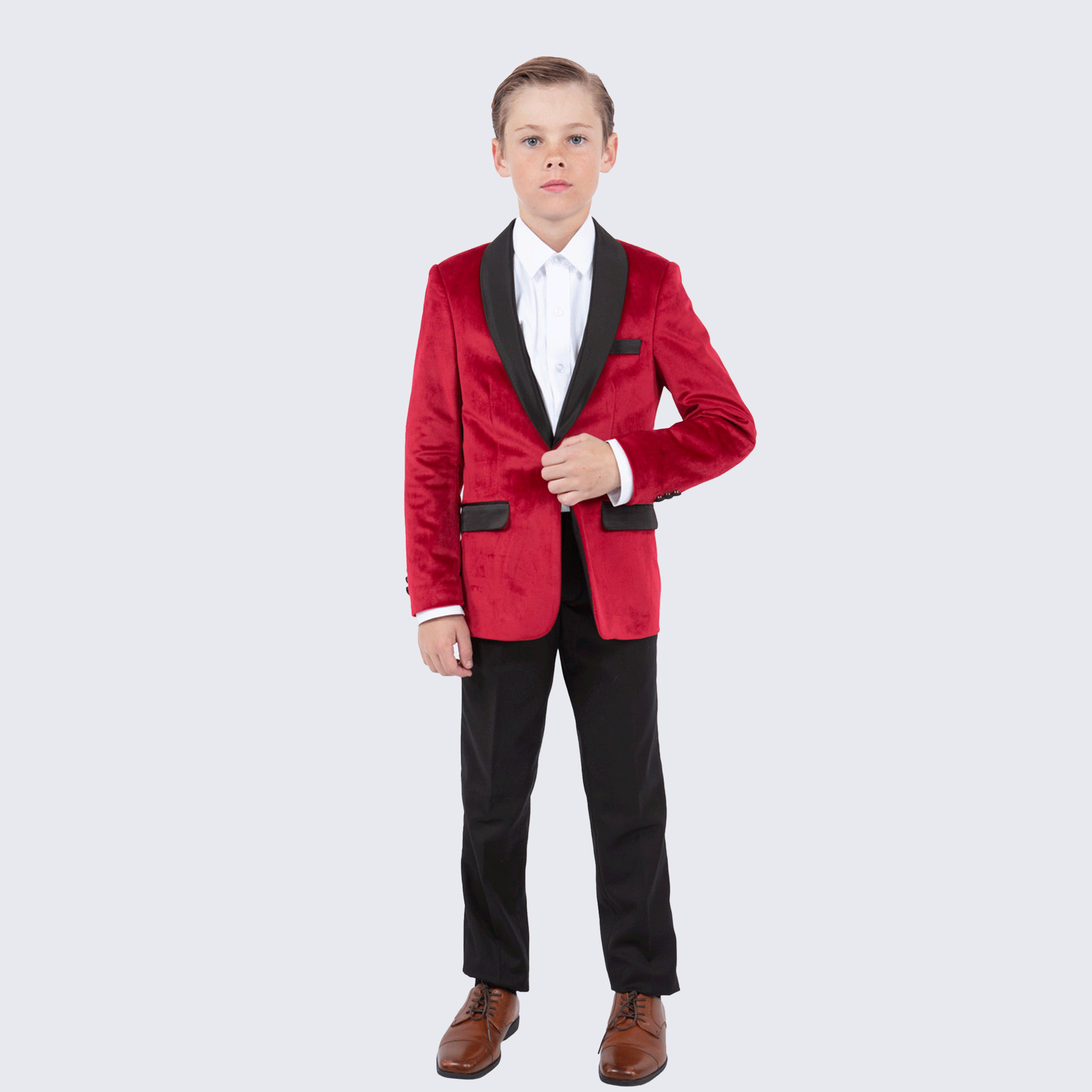 This red velvet tuxedo blazer for boys, features a satin shawl collar, one satin button closure, a side pocket with satin flaps, and a double vent. The jacket is fully lined. Artistic, stylish, and expertly tailored. All the features you need for your child's special occasion. This is the perfect way to elevate any outfit with ease and sophistication, thanks to the luxurious velvet material and elegant satin details. With a single button closure and functional pockets, your child will feel comfortable and confident throughout the day. Plus, the double vent design adds a touch of class and ensures a perfect fit. And with the added bonus of a full lining, this jacket is truly a must-have for any young gentleman's wardrobe. Jacket only. Add optional boys black tuxedo shoes or find shoes here.